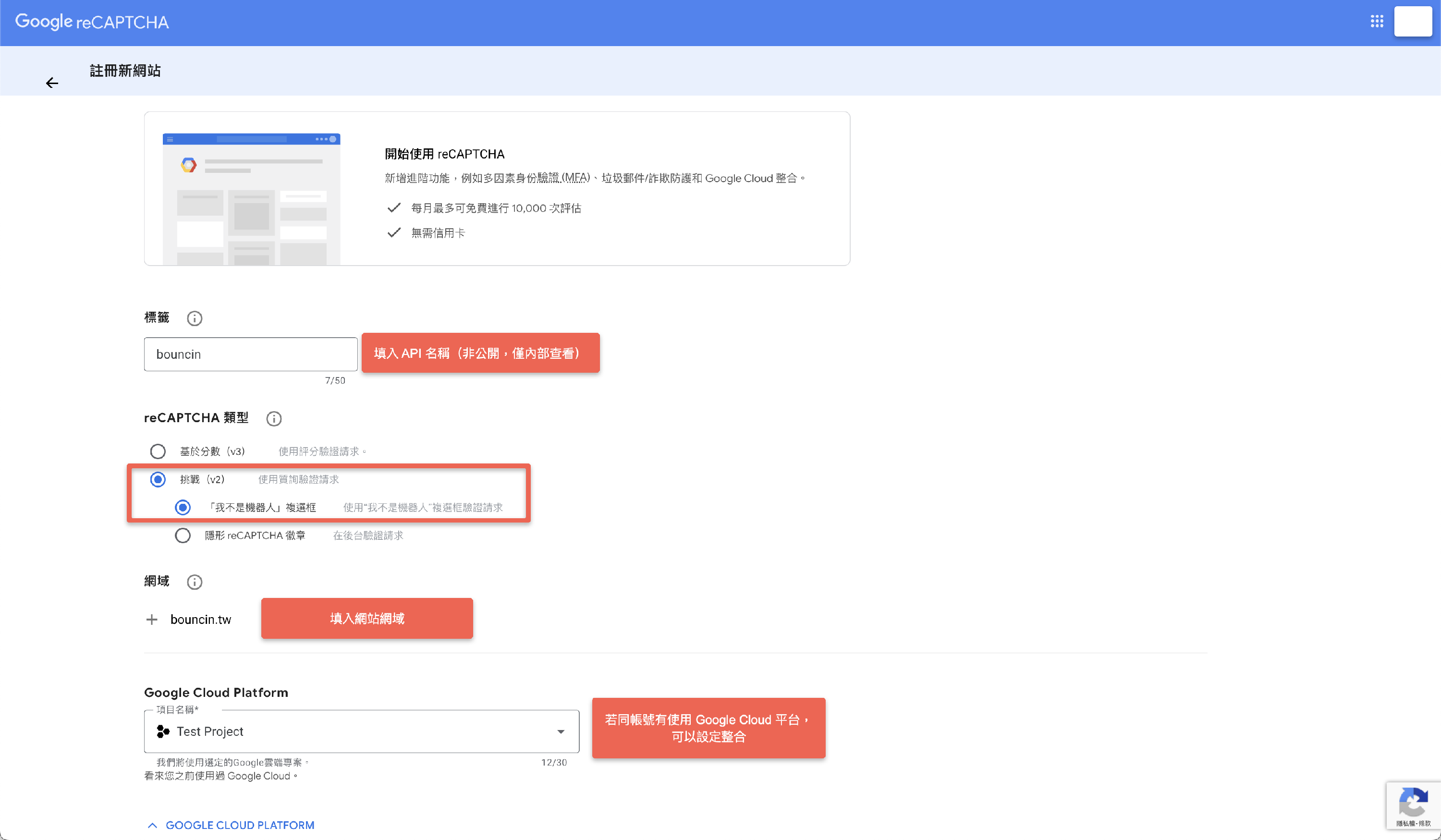 - 請 點選這裡 進入 reCAPTCHA 設定平台
