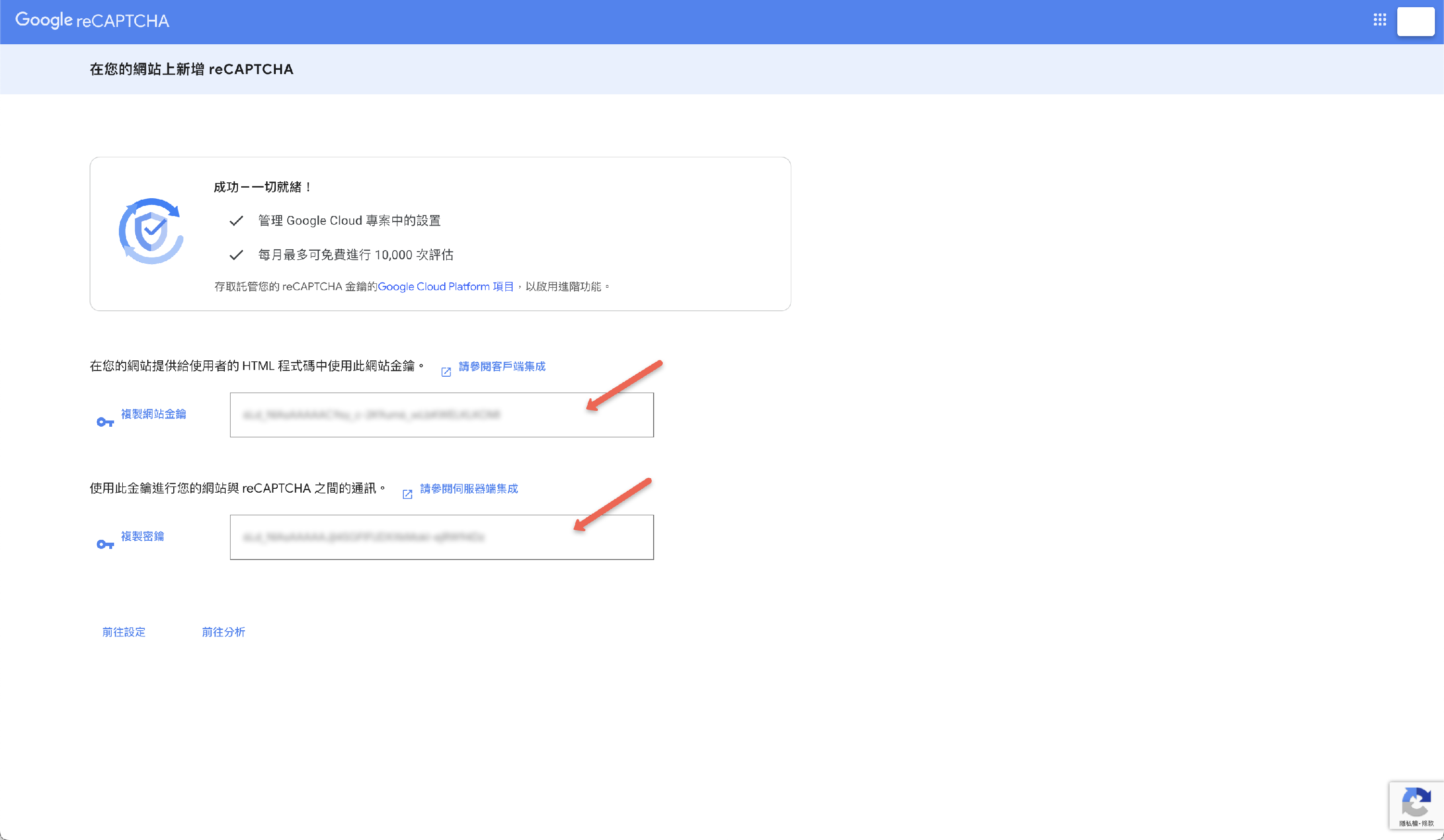 最後把圖中欄位裡的「網站金鑰」及「密鑰」,用複製提供給我們就可以囉!