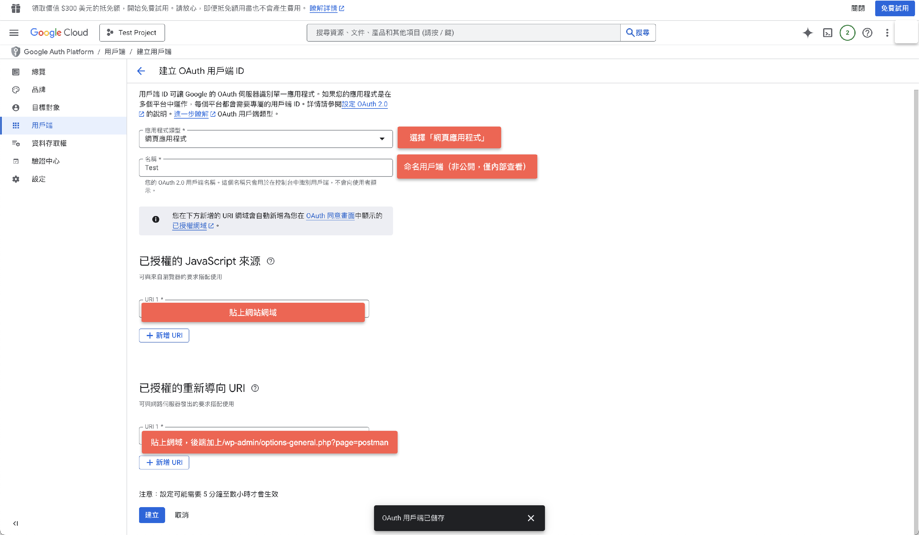d. 已授權的重新導向 URl:主網域後面加 /wp-admin/options-general.php?page=postman (例如: https://bouncin.tw/wp-admin/options-general.php?page=postman)